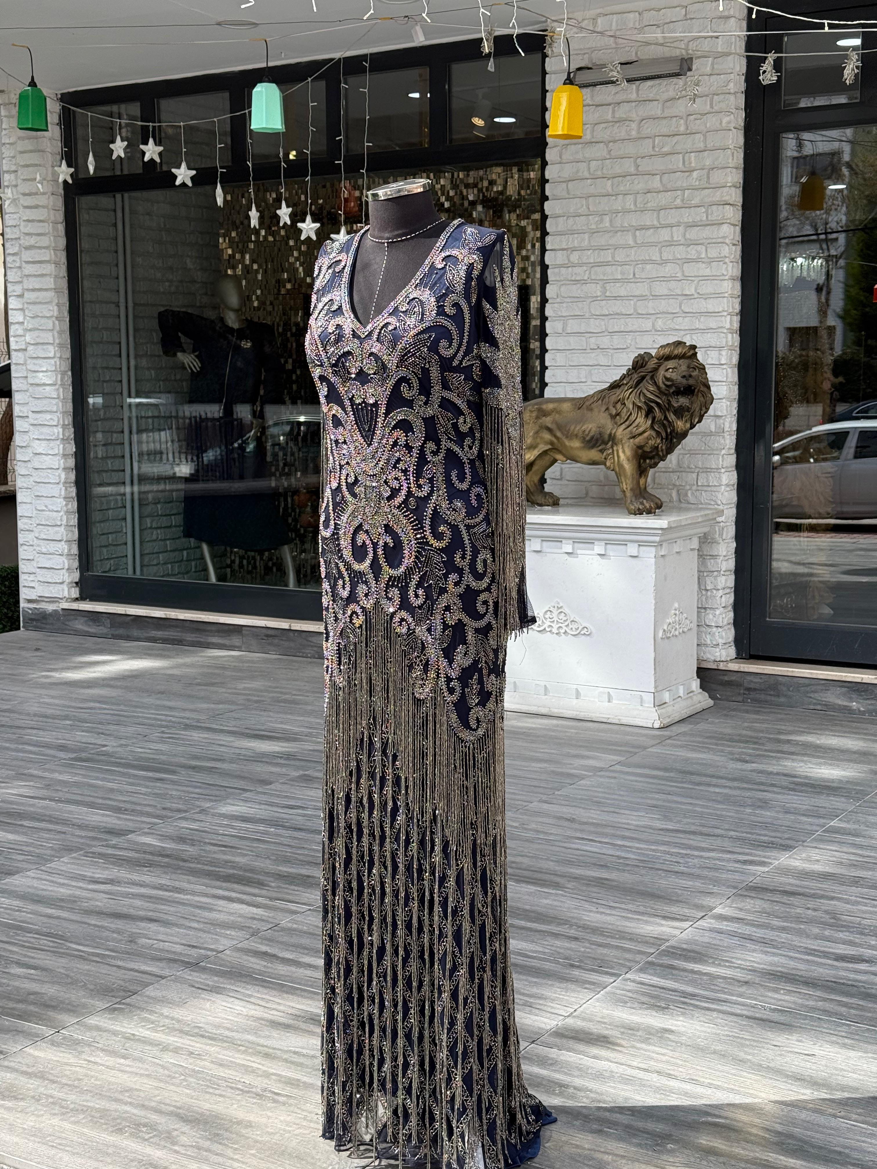 Üst düzey işçilik ve tasarımın buluştuğu bu el taş işlemeli ithal abiye, tamamen kasnak el işçiliği ile hazırlanmış özel bir parçadır. Baştan sona yoğun şekilde işlenen taş ve desen detayları, elbiseye eşsiz bir ihtişam ve göz alıcı bir ışıltı kazandırır.