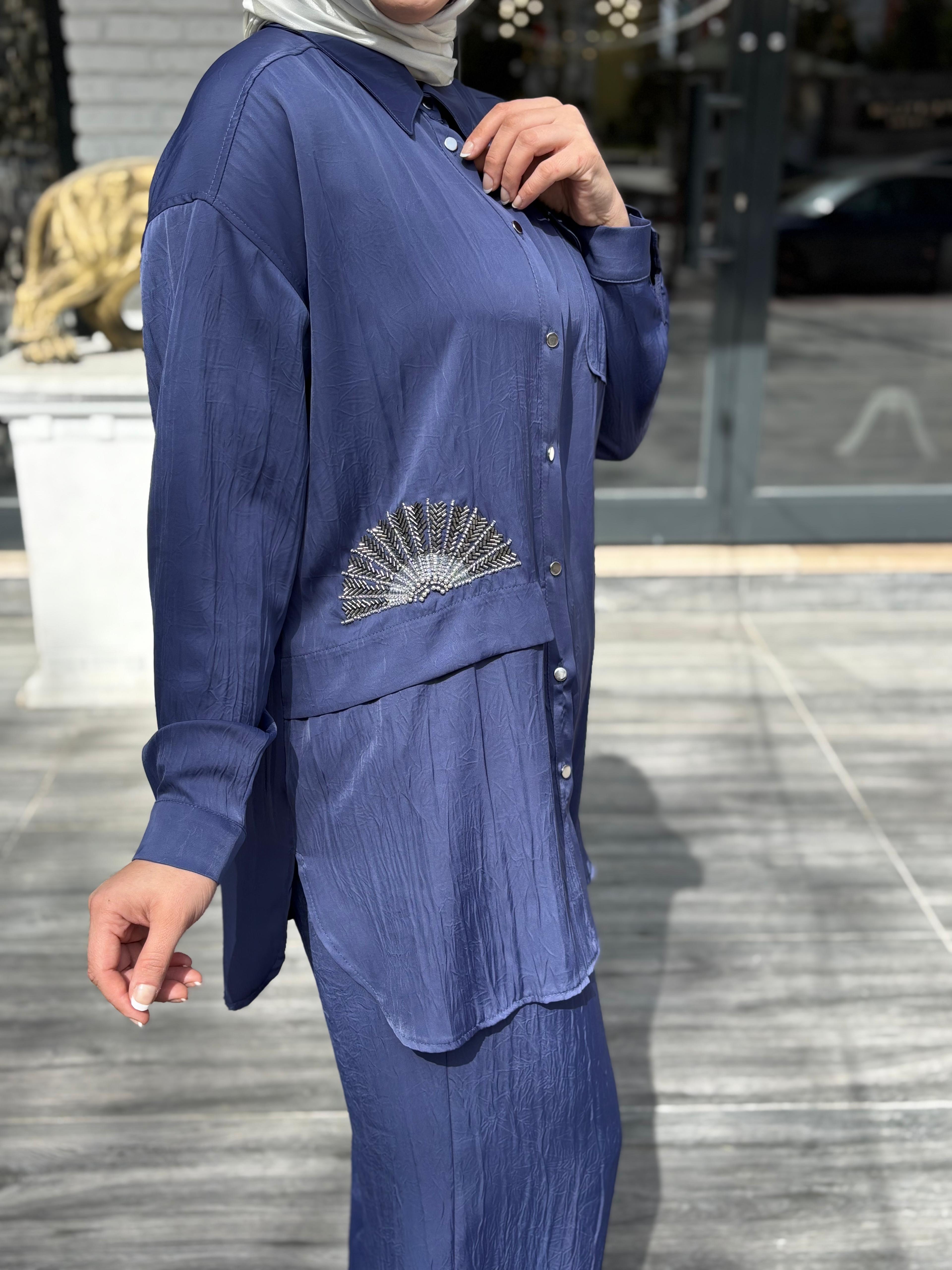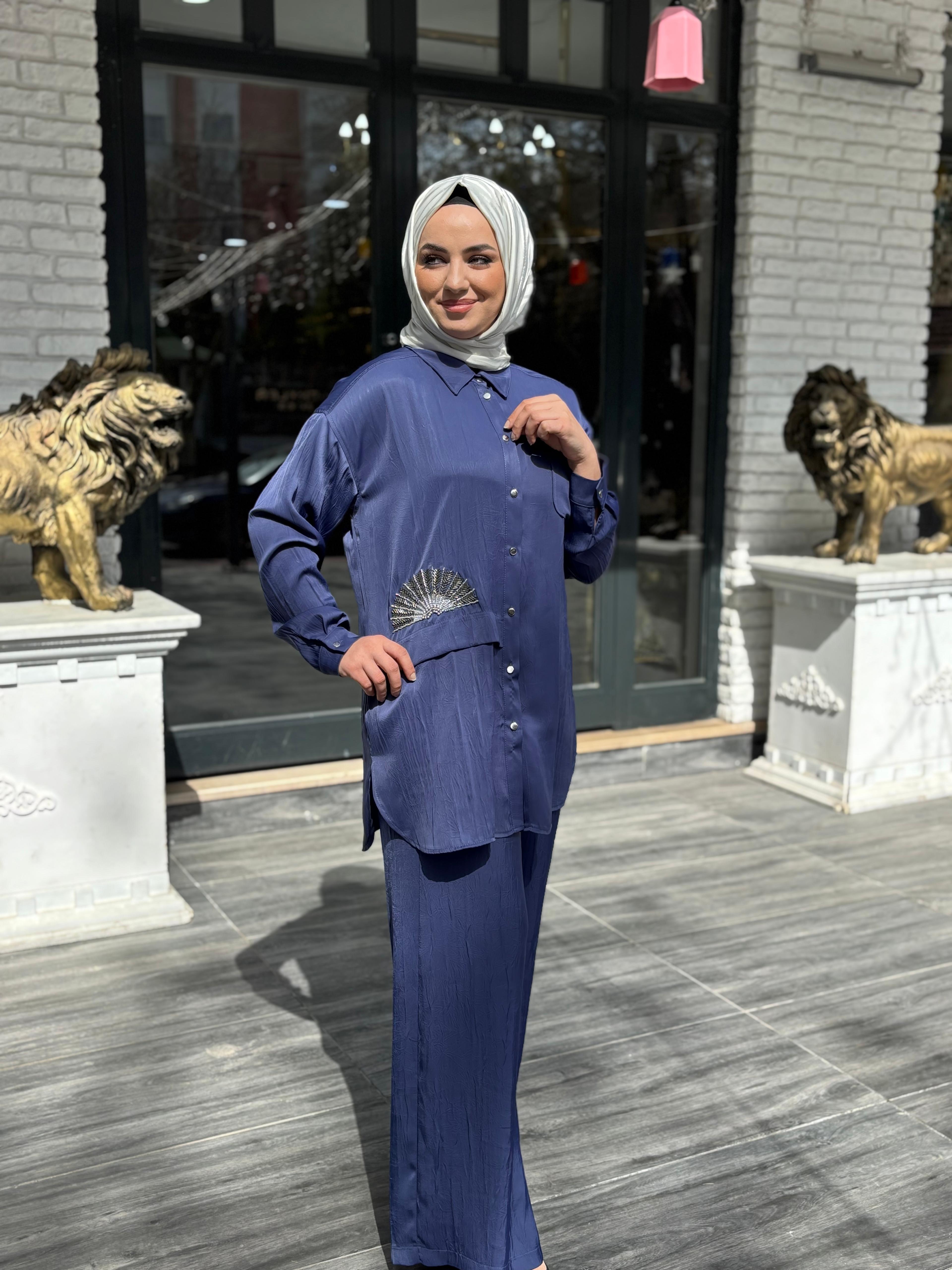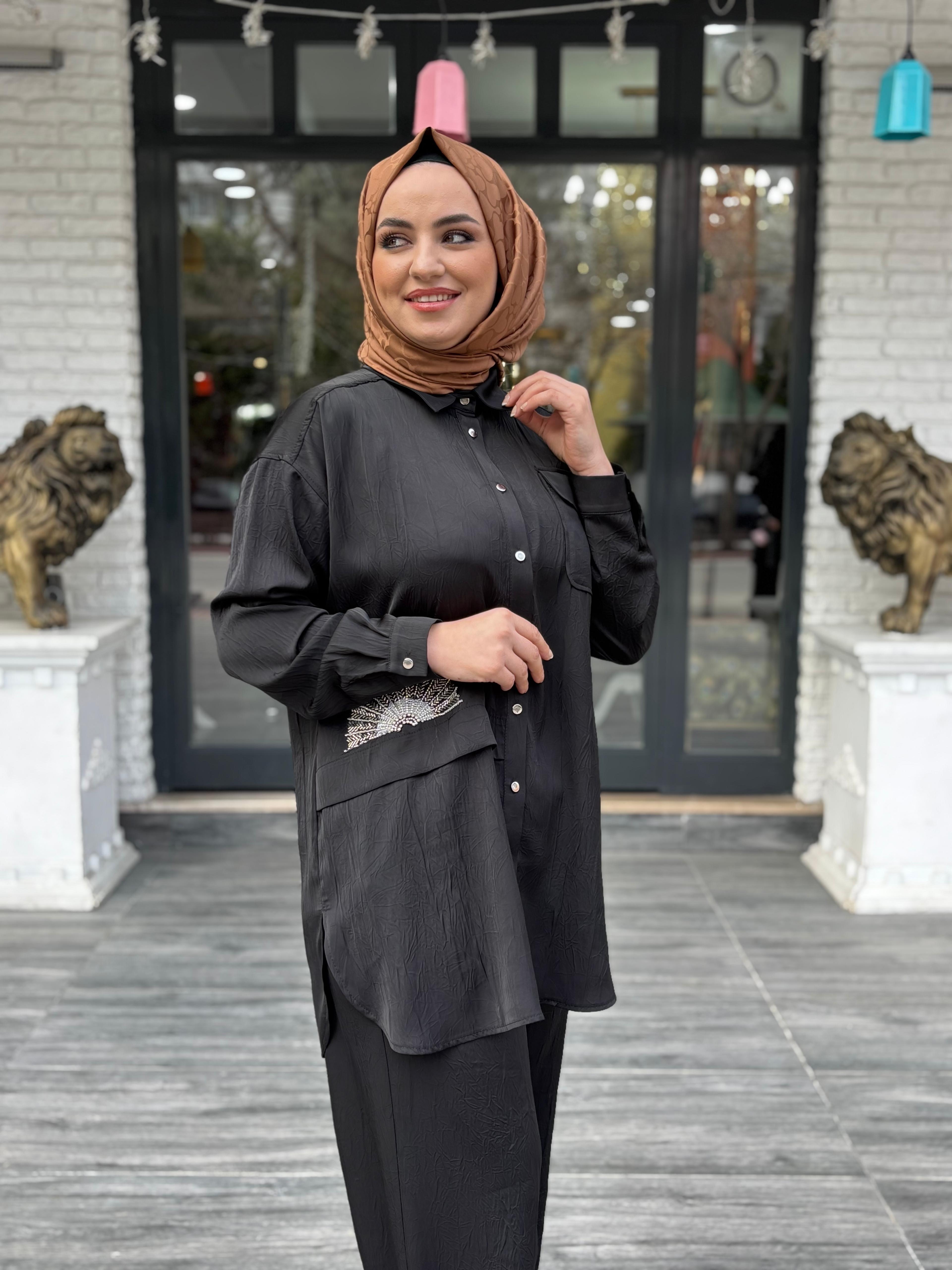 Şık detayları ve kaliteli kumaşıyla hem günlük kombinler hem de özel davetlerde tercih edilebilecek bu model, zarif ve modern bir tesettür takım arayanlar için ideal bir seçenektir.
