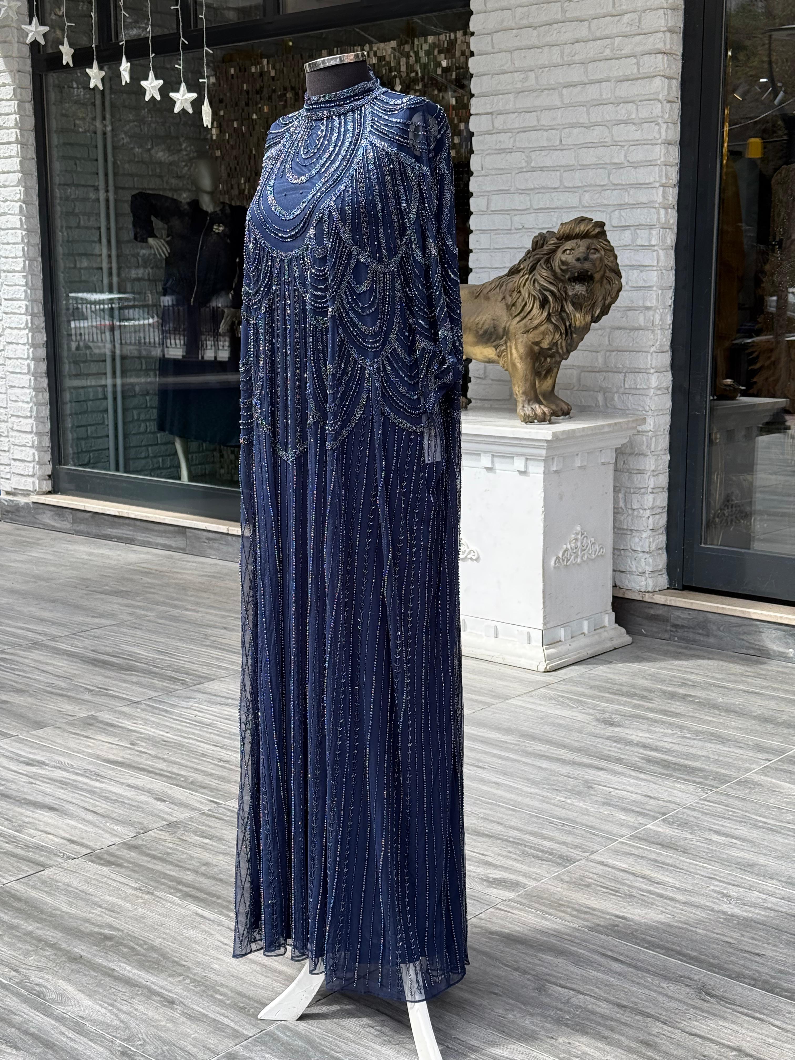 Işıltının en zarif haliyle buluştuğu ithal taş el işlemeli pelerin model abiye, özel günlerde tüm dikkatleri üzerinize çekmeniz için tasarlandı. Baştan sona ince işçilikle yerleştirilmiş taş detayları, elbiseye göz alıcı bir ışıltı kazandırırken lüks bir görünüm sunar.