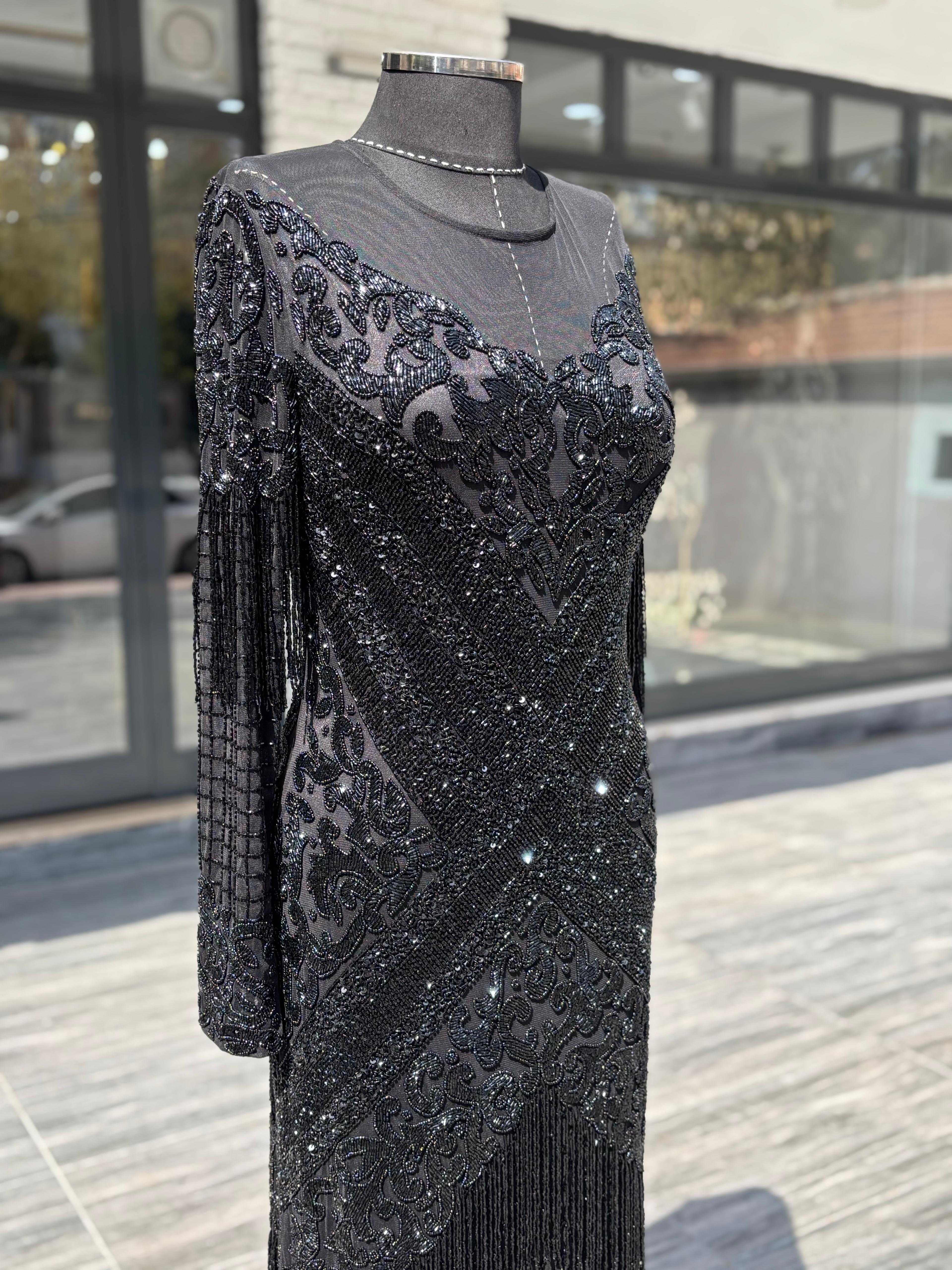 Uzun ve vücuda zarifçe oturan kesimi sayesinde feminen bir siluet sunarken, transparan yaka detayı modern ve sofistike bir dokunuş sağlar. Kol detaylarındaki ince işçilik ve etek kısmındaki yoğun desen geçişleri tasarıma derinlik katar.
