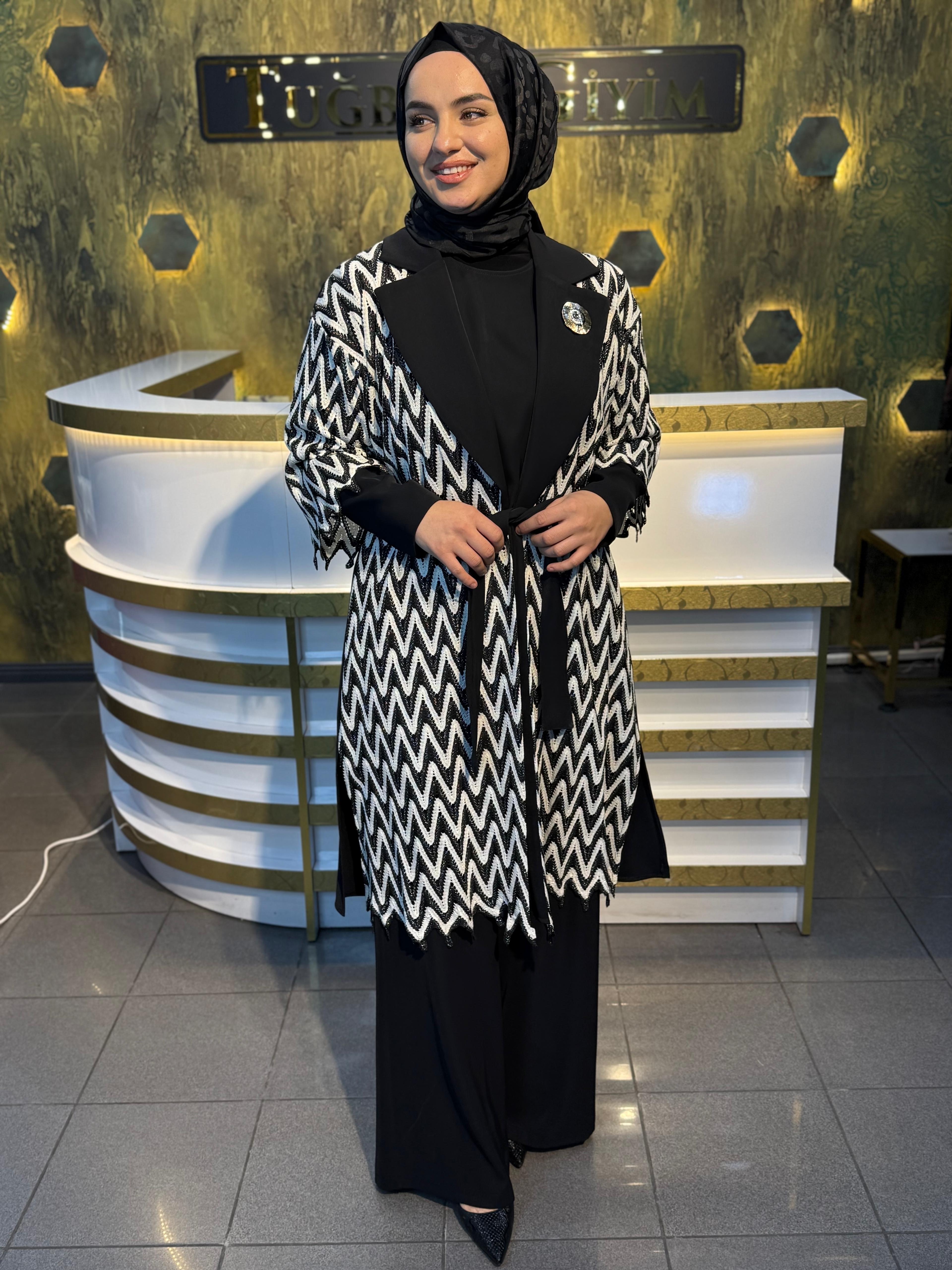 Takımın en dikkat çekici parçası olan kazayağı desenli ceket, klasik ve modern tarzın birleşimini sunarak kombine hareket ve şıklık katar. İç parça ve pantolon ile tamamlanan üçlü set, uyumlu tasarımı sayesinde zahmetsiz bir şıklık oluşturur.