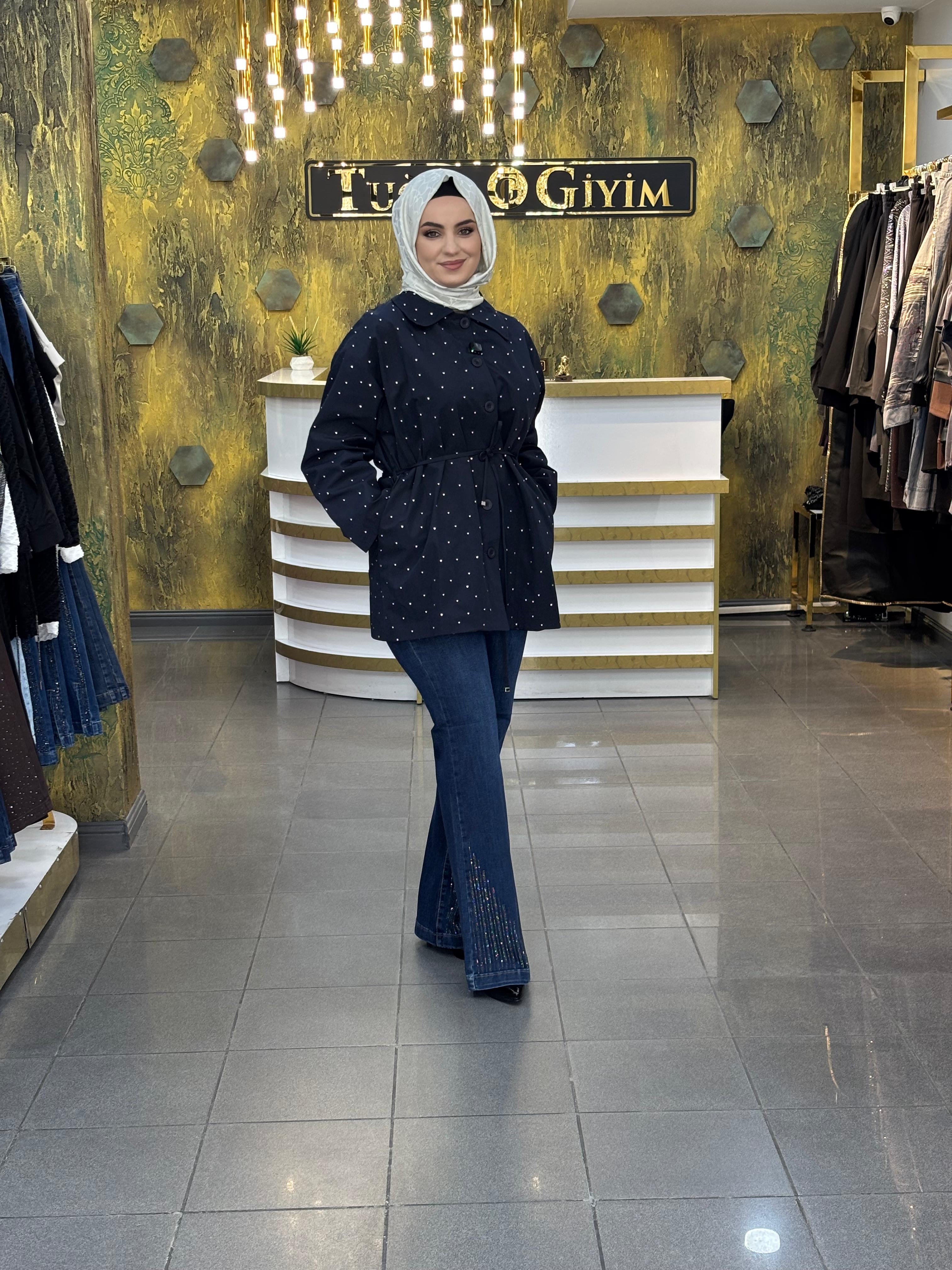 Pantolon kısmı ispanyol paça kesimi ile modern bir duruş kazandırır. Paça bölümünde bulunan taş detayları tasarıma hareket ve zarafet katarak dikkat çekici bir görünüm oluşturur.