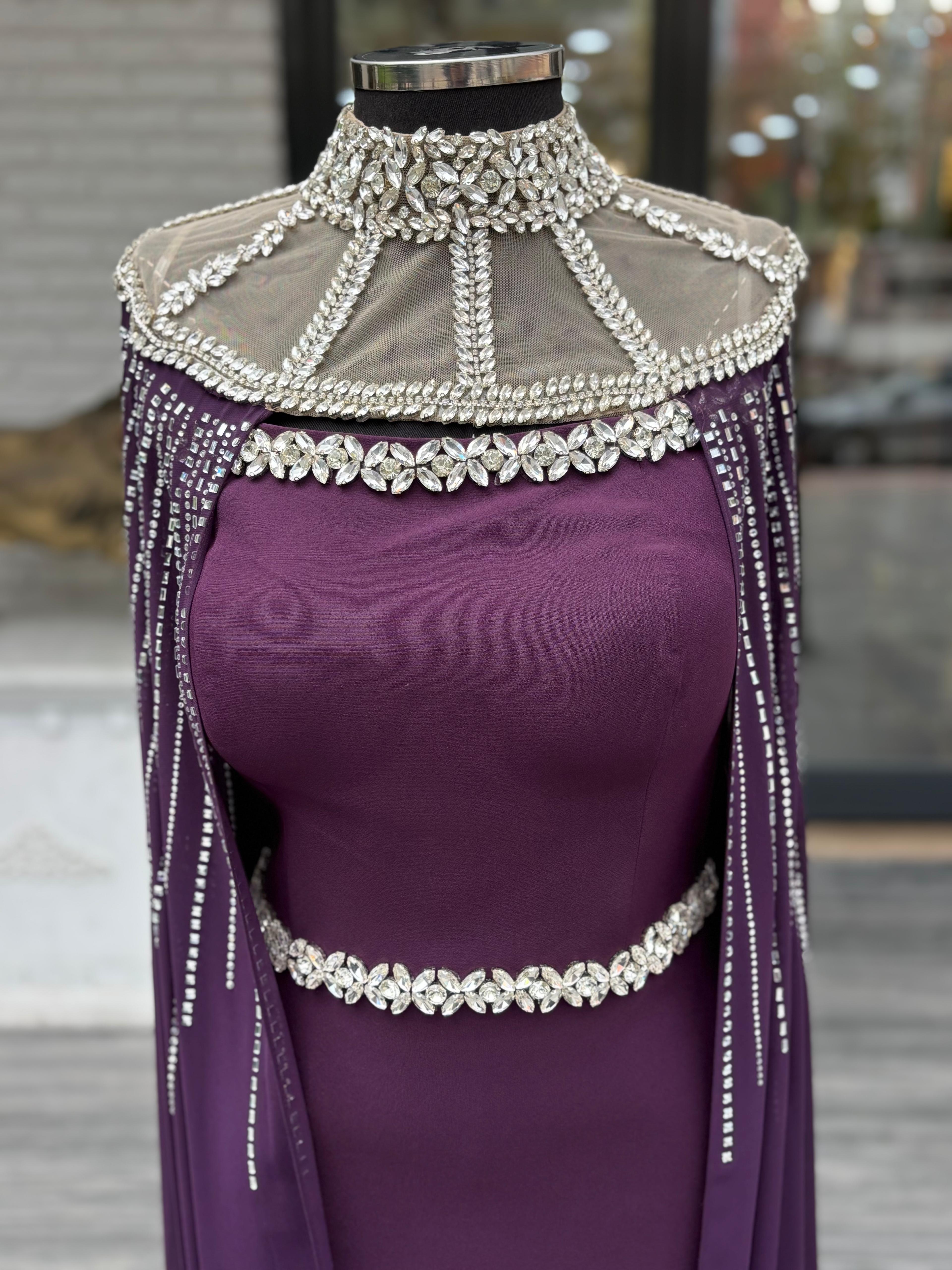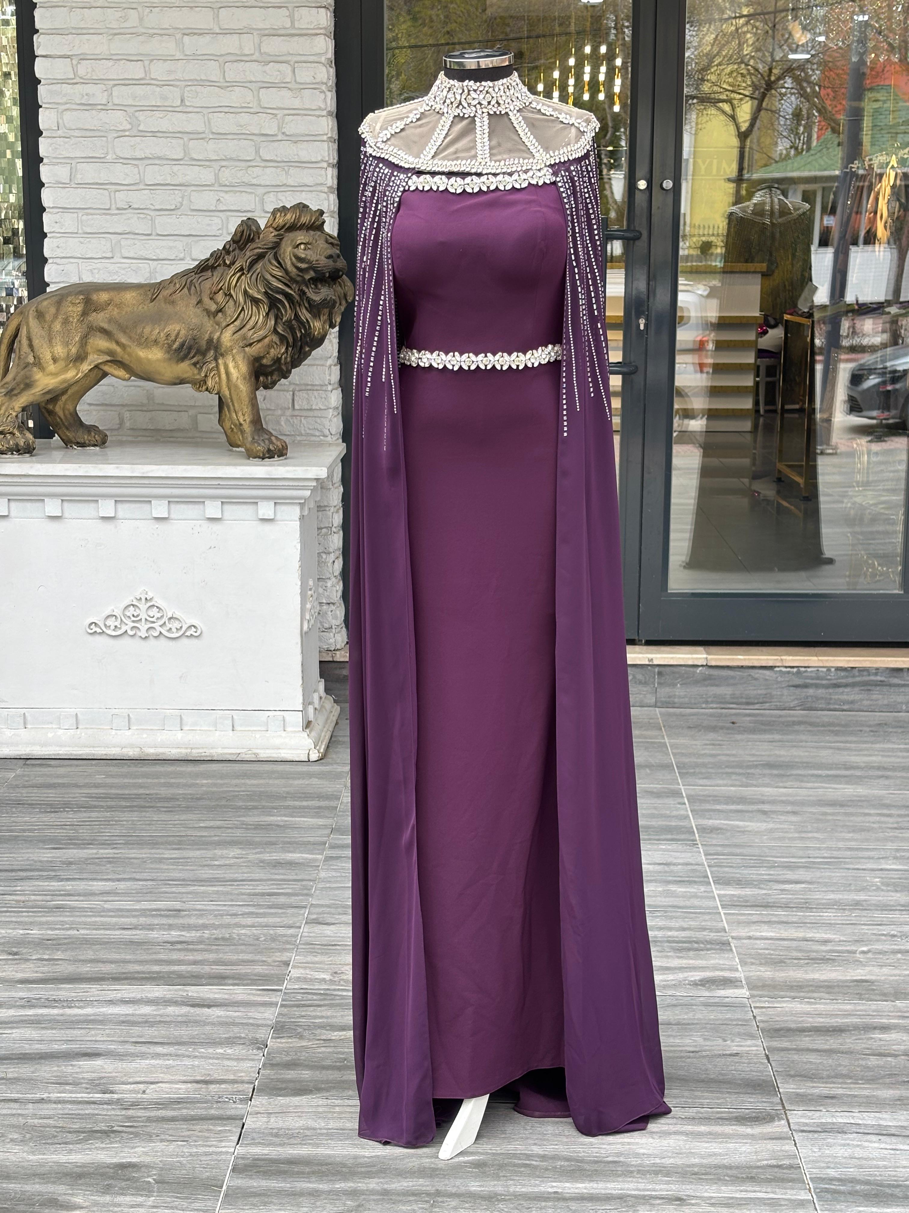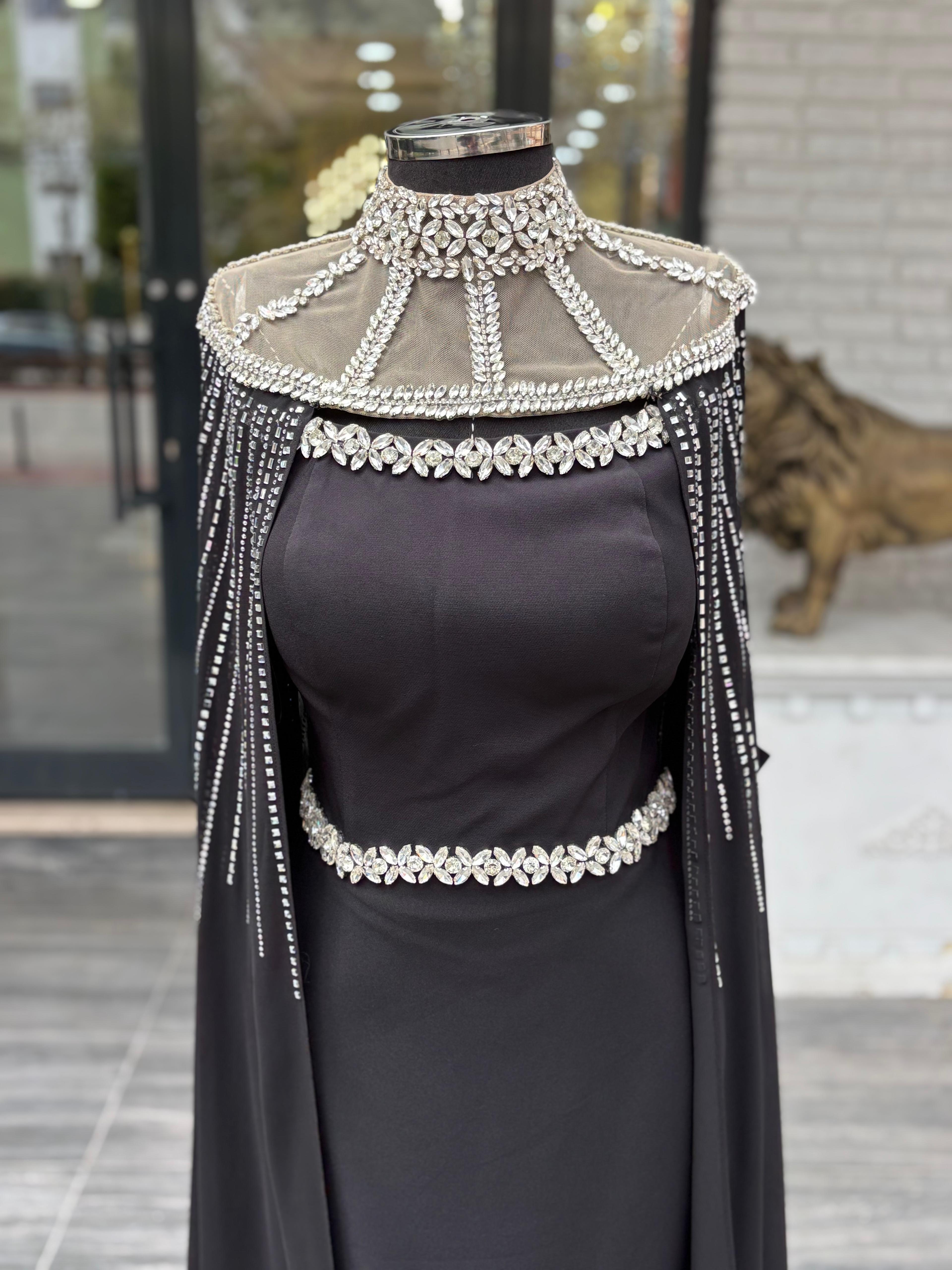 Zarif ve etkileyici bir stil sunan bu taş işlemeli pelerinli abiye elbise, özel davetlerde şıklığıyla öne çıkmak isteyen kadınlar için tasarlanmıştır. İç kısmında yer alan straplez balık model elbise, vücut hatlarını kusursuz bir şekilde sararak feminen bir görünüm sunar.