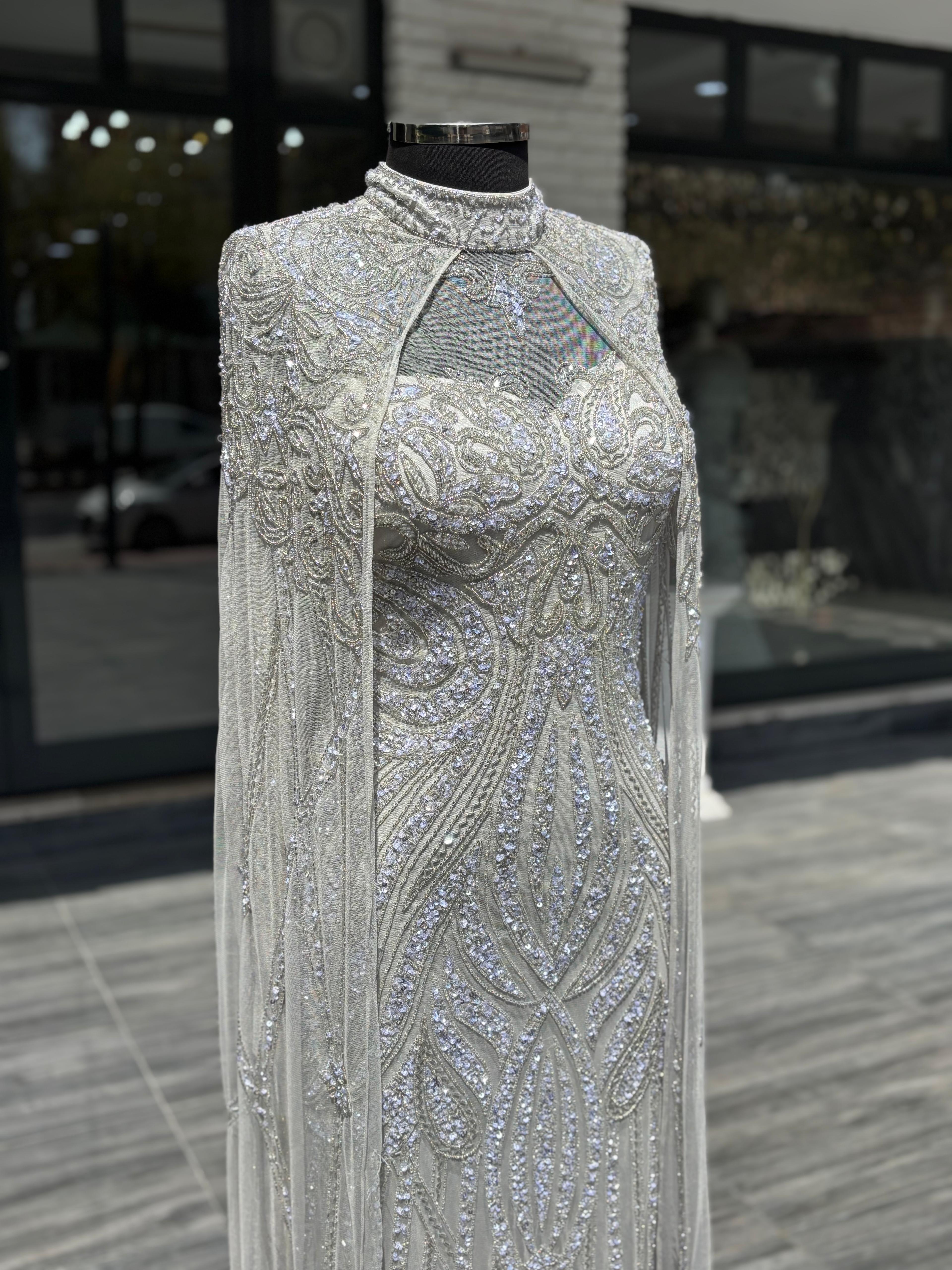 El işçiliğiyle hazırlanan taş işlemeleri, elbiseye ışıltılı ve sofistike bir hava katarken; sade beyaz tonuyla dengeli ve asil bir görünüm oluşturur. Akıcı ve uzun kesimi sayesinde vücuda zarif bir form kazandırır.