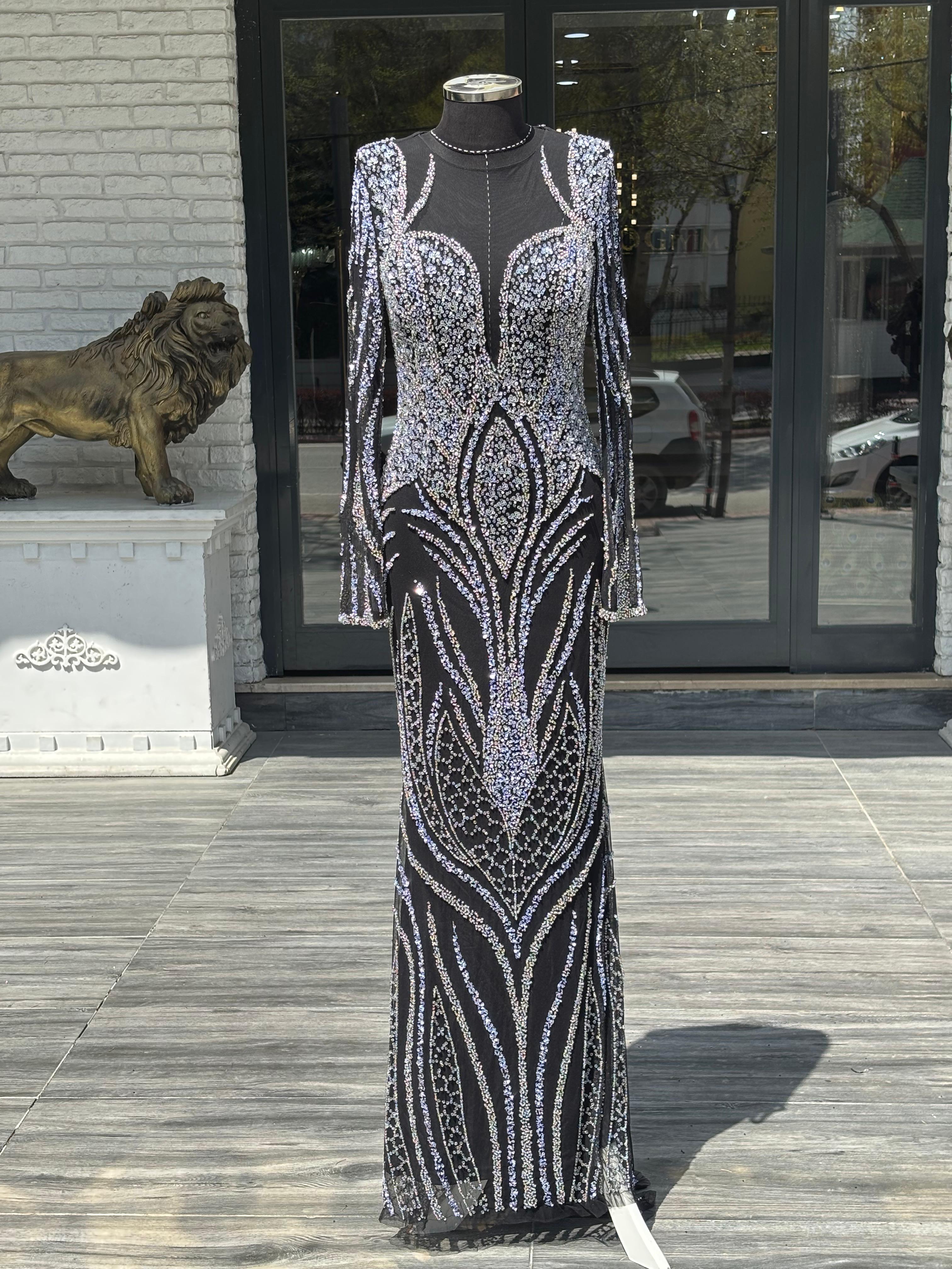 El işçiliğinin ön planda olduğu bu özel tasarım, her açıdan ışığı yansıtarak etkileyici bir duruş sergiler. Vücuda zarifçe oturan kesimi, feminen silueti ön plana çıkarırken; güçlü ve iddialı bir stil oluşturur.